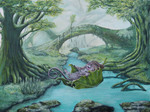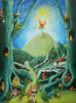 2025Sfeervol schilderij van een boslandschap met paddenstoelen een eekhoorn en een slak