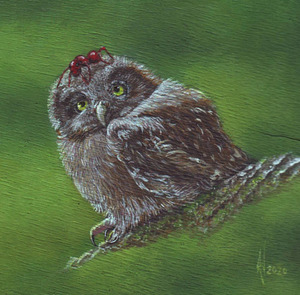 2020Gedetailleerd schilderij van een uil die te maken heeft met een brutale mier. Het schilderijtje zit in een zwart houten lijst.