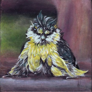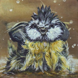 2020Klein schilderij van een badende koolmees. Wordt met breed zwart houten lijst geleverd.