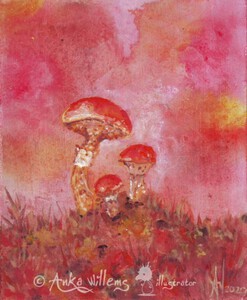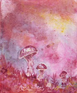 2020Een sfeervol schilderijtje van roze champignons met een kleurrijke achtergrond.